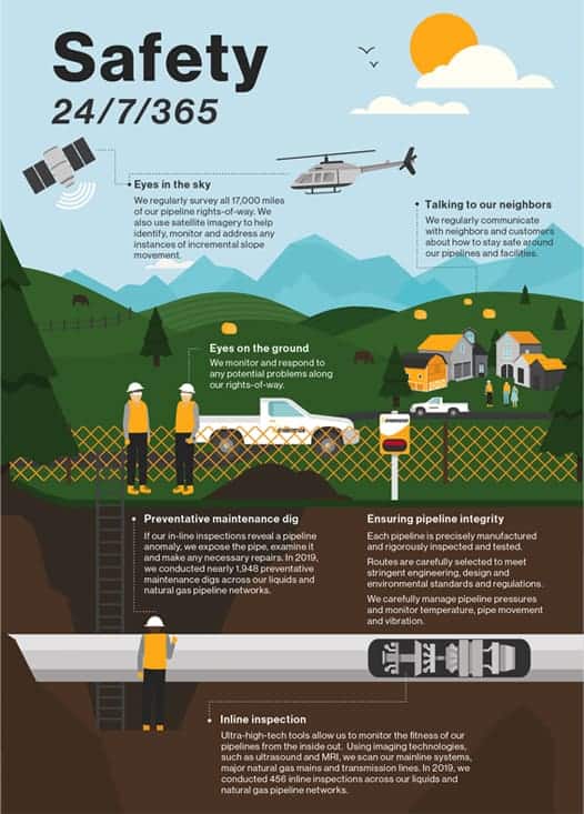 The people who live near our pipelines expect us to operate safely, and the protection of the public and the environment is our highest priority. We see pipeline safety as both an investment, and an obligation. And we use the latest tools, technologies and strategies—while closely monitoring the products we transport—to keep our pipelines operating safely, reliably, and in an environmentally responsible manner.